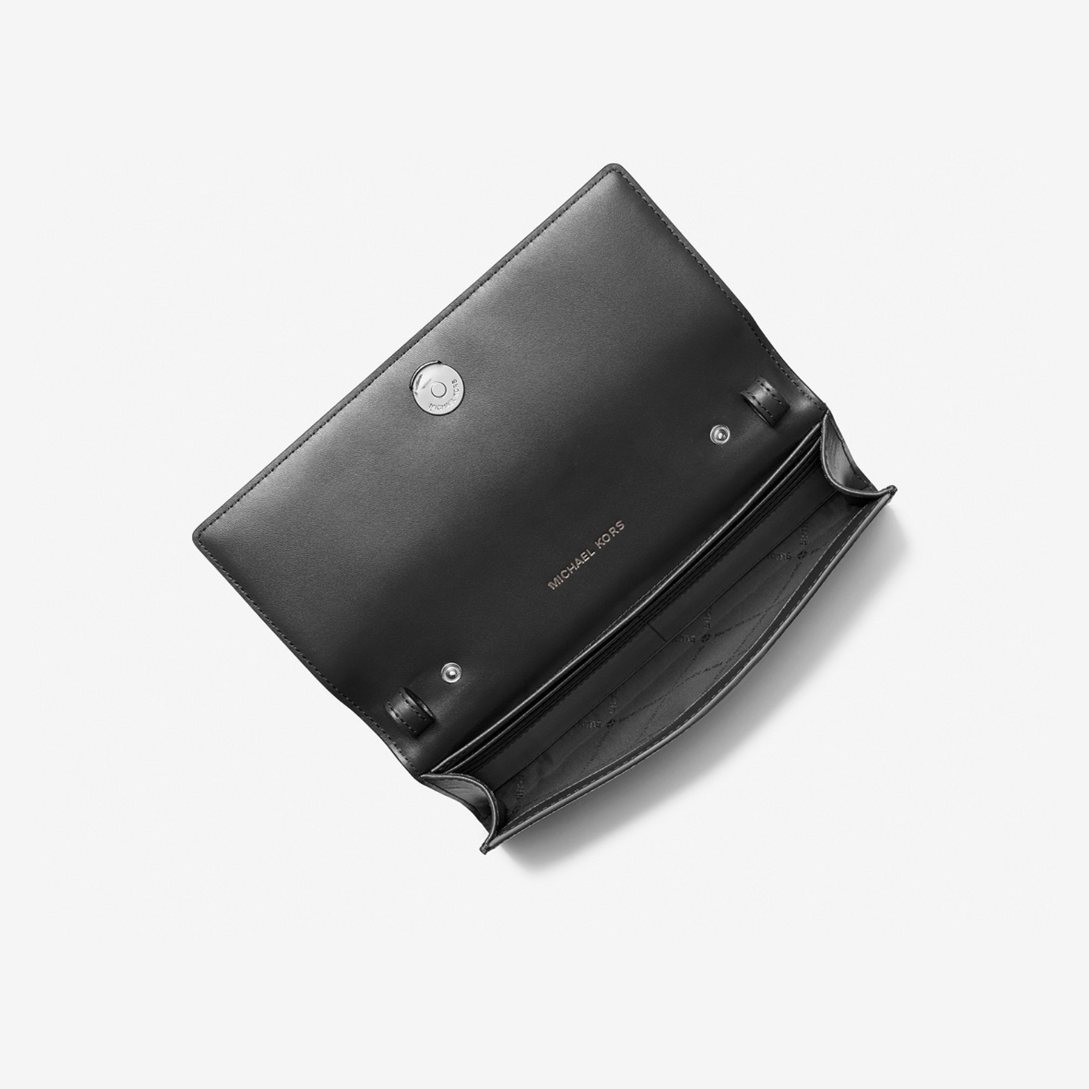 The MICHAEL KORS OUTLET CARSON Pebbled Leather Convertible Crossbody Large is a sophisticated and versatile piece that perfectly balances practicality with timeless style. Crafted from supple pebbled cow leather in classic black, it offers a refined texture and enduring durability, making it an ideal companion for both daily use and evening occasions. Its minimalist silhouette is complemented by clean lines and a full flap closure with a magnetic button, adding a touch of understated elegance.