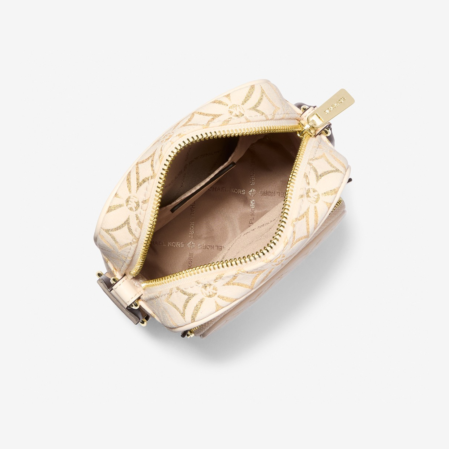 The MICHAEL KORS OUTLET JET SET ITEM Metallic Logo Jacquard Crossbody Medium is crafted as the ultimate balance between luxury design and everyday practicality. Made from a refined jacquard fabric in light cream multi with a subtle metallic finish, it offers a sophisticated texture that feels both modern and timeless. The bag is elevated by the iconic MK logo tape running along the adjustable shoulder strap, adding a bold graphic accent that enhances its sleek silhouette.