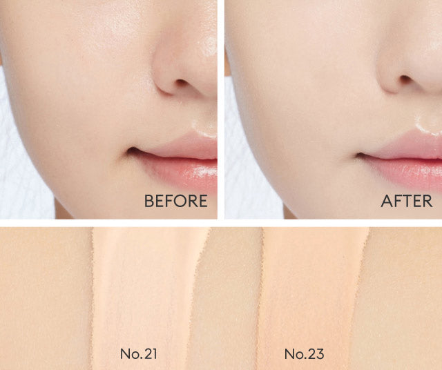 This cushion foundation covers pores and uneven skin tone, providing a semi-matte finish.