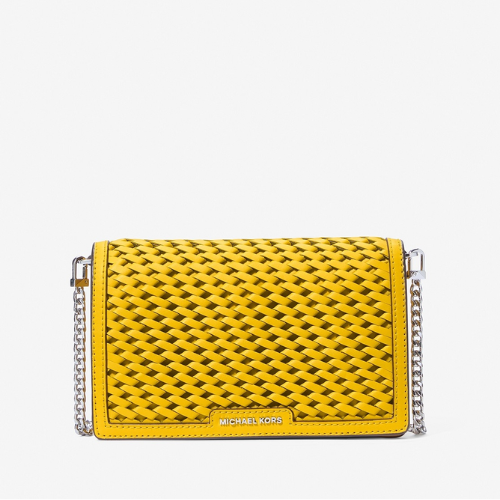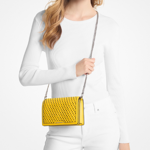 A Michael Kors Jet Set Woven Leather Crossbody Medium combina artesanato e glamour em um modelo compacto, perfeito para o dia e a noite. Seu corpo em couro trançado à mão e detalhes polidos conferem textura e elegância, enquanto o fecho de aba com botão magnético garante que seus itens essenciais estejam seguros.
