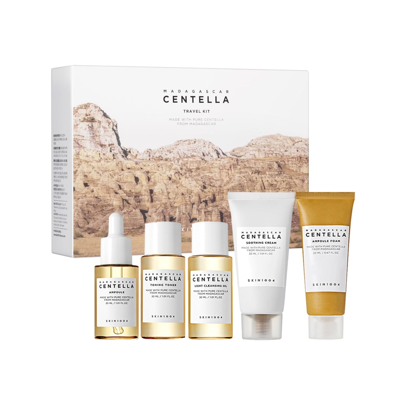 O Kit de Viagem SKIN1004 Madagascar Centella é uma coleção compacta e premium de cuidados com a pele, elaborada com extrato puro de Centella Asiática, proveniente das terras altas intocadas de Madagascar, renomada por sua concentração excepcional de compostos ativos como Madecassoside e Asiaticoside. Este item essencial para viagens inclui cinco produtos cuidadosamente formulados em tamanhos práticos para viagem: Óleo de Limpeza Leve de 30 ml, Espuma de Ampola de 20 ml, Tônico Tonificante de 30 ml, Ampola Concentrada de 30 ml e Creme Suavizante de 30 ml. Todos são projetados para proporcionar um cuidado suave, porém eficaz, para peles sensíveis, reativas ou fatigadas durante viagens, viagens de negócios ou no dia a dia.